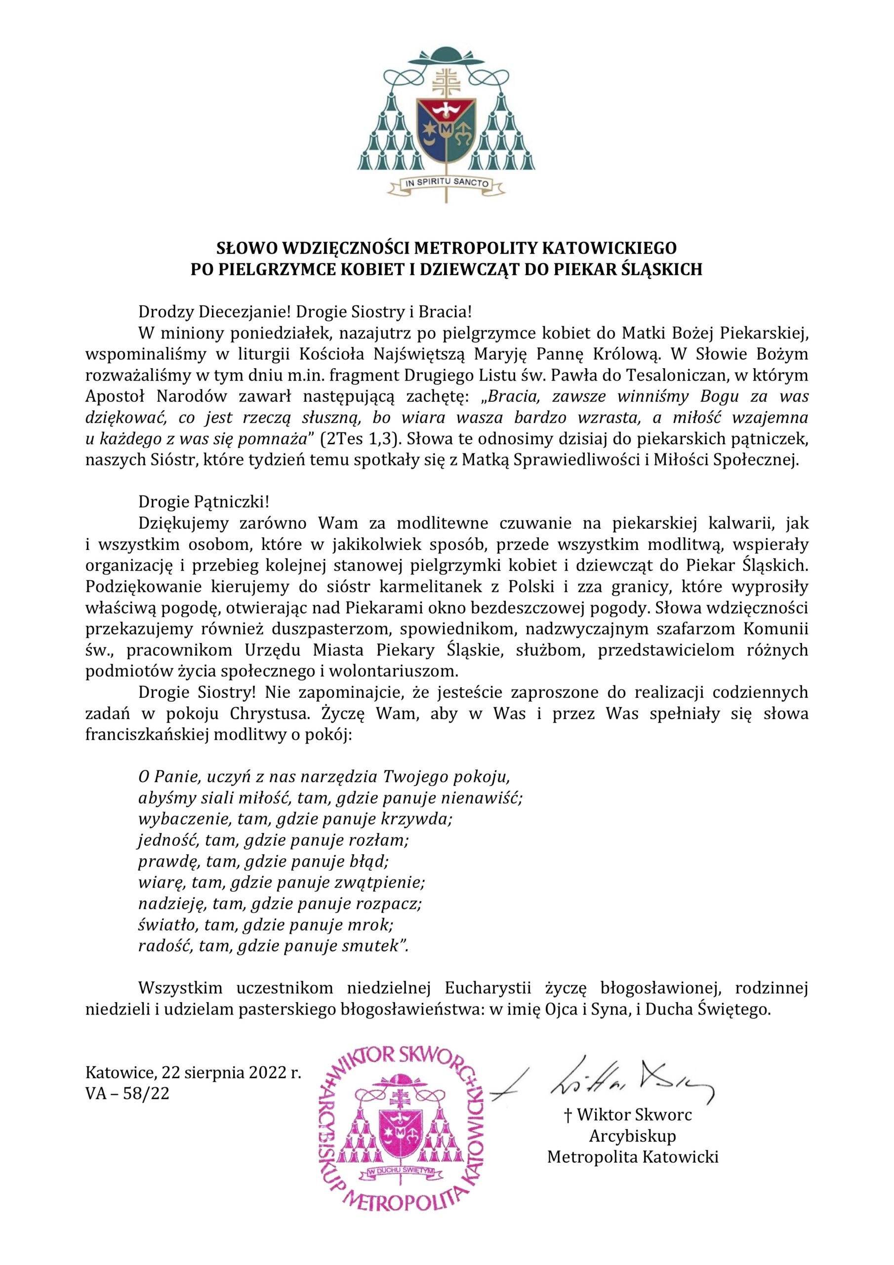 Abp_Słowo wdzięcznośći po pielgrzymce kobiet
